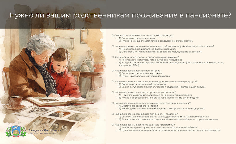 Выбирая подходящий пансионат для пожилого человека, важно учитывать множество факторов: уровень ухода, медицинское сопровождение, комфорт проживания и социальную активность. Пройдите опрос “Нужно ли вашим родственникам проживание в пансионате”, если у вас больше ответов Б, то мы рекомендуем проживание в пансионате.